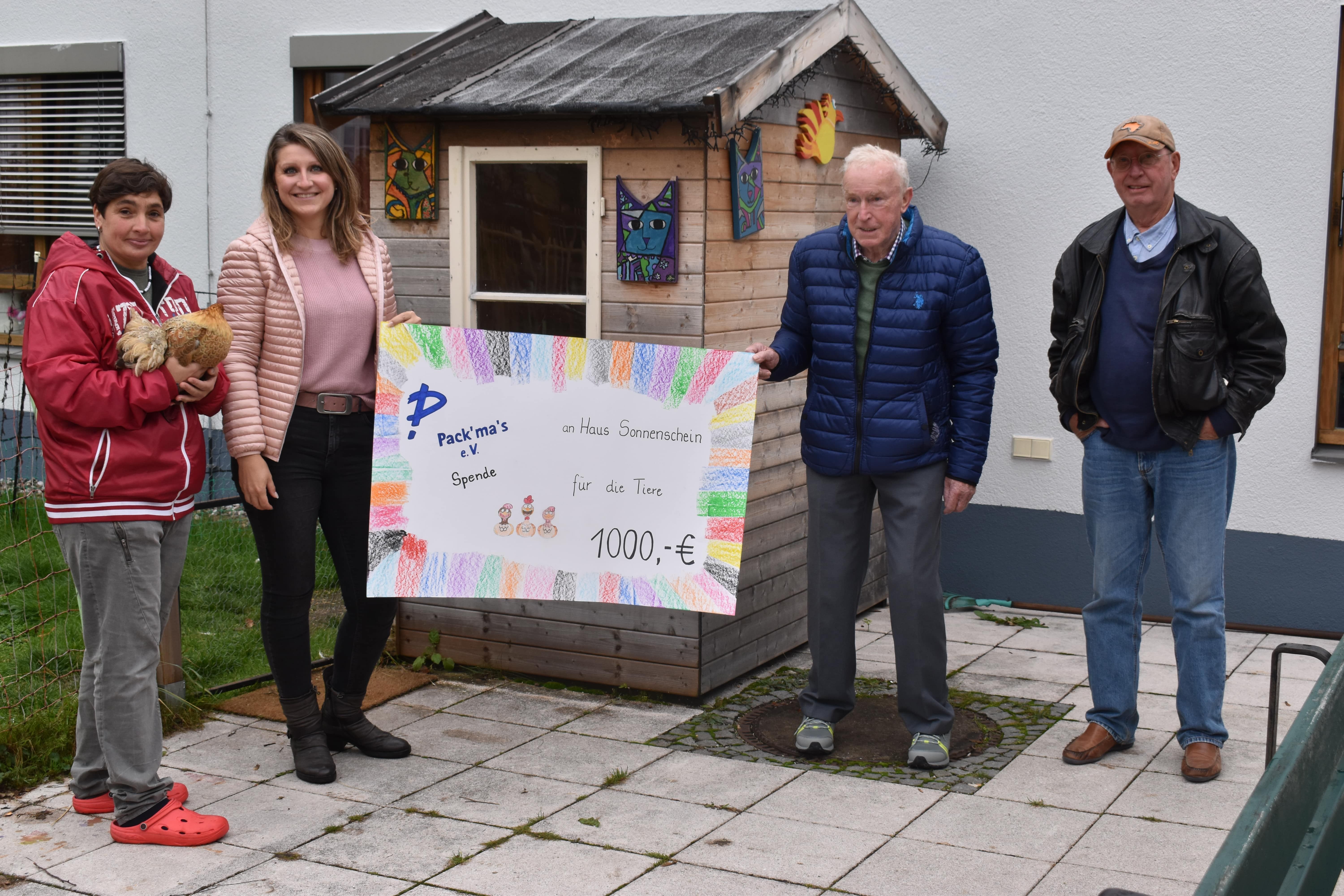 Bad Tölz, 19.10.2020. Die Bewohner von Haus Sonnenschein der ReAL Isarwinkel in Bad Tölz haben für ihr Therapie-Projekt mit Tieren eine großzügige Spende des gemeinnützigen Vereins Pack‘ ma’s e.V. erhalten. Der Scheck in Höhe von 1.000 EUR wurde jetzt, von Pack‘ ma’s – Vorstandsmitglied Wilhelm Pieper und dem dem Vorstand, Dr. Arnold Torhorst, an Einrichtungsleiterin Monika Mühlbauer überreicht. „Mit dem Geld kann unsere Gartenanlage weiter verschönert und vor allem der vorhandene Hühnerstall modernisiert werden“, freut sich Karmen Langer als „Hühnerstallbeauftragte“ von Haus Sonnenschein. Der Hühnerstall ist seit November 2019 fester Bestandteil unseres Wohnangebots mit Fokus auf gesellschaftliche Teilhabe. Die Bewohner kümmern sich liebevoll um die Tiere und sorgen für deren Wohlbefinden.