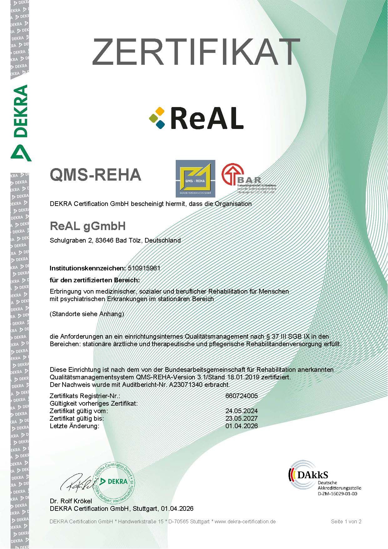 Im Real Verbund Bad Tölz ist Qualität kein Zufall, sondern Ergebnis klar definierter Instrumente und Standards. Unser Qualitätsmanagement folgt der international anerkannten Norm ISO 9001:2015 und wird regelmäßig intern wie extern überprüft.